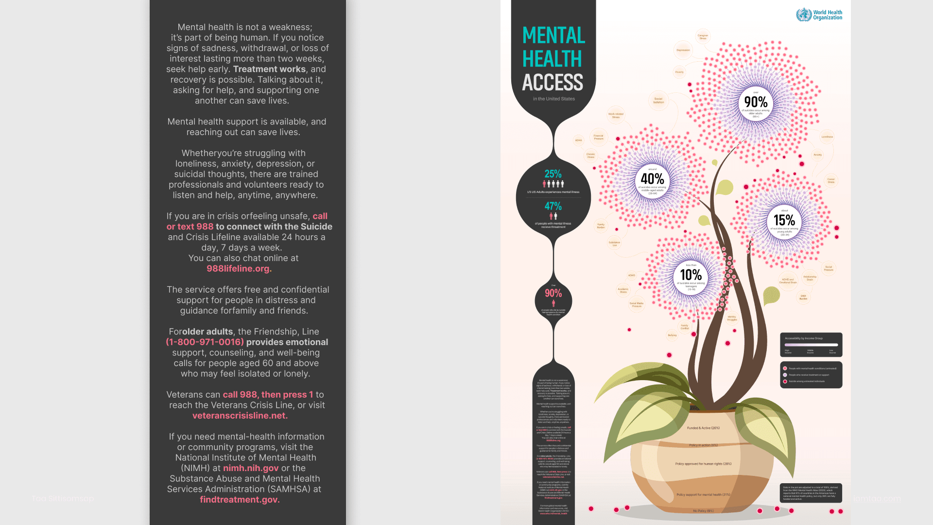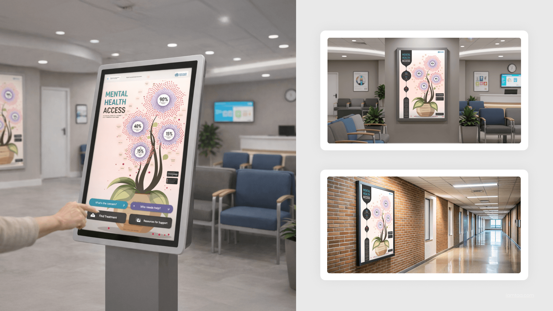 The design continues into posters or kiosks in clinics, where people can explore the information in more detail. The poster also provides practical resources, so if someone is struggling, they can immediately find support. The goal is not just awareness, but also helping people take action through the resources included directly on the poster.