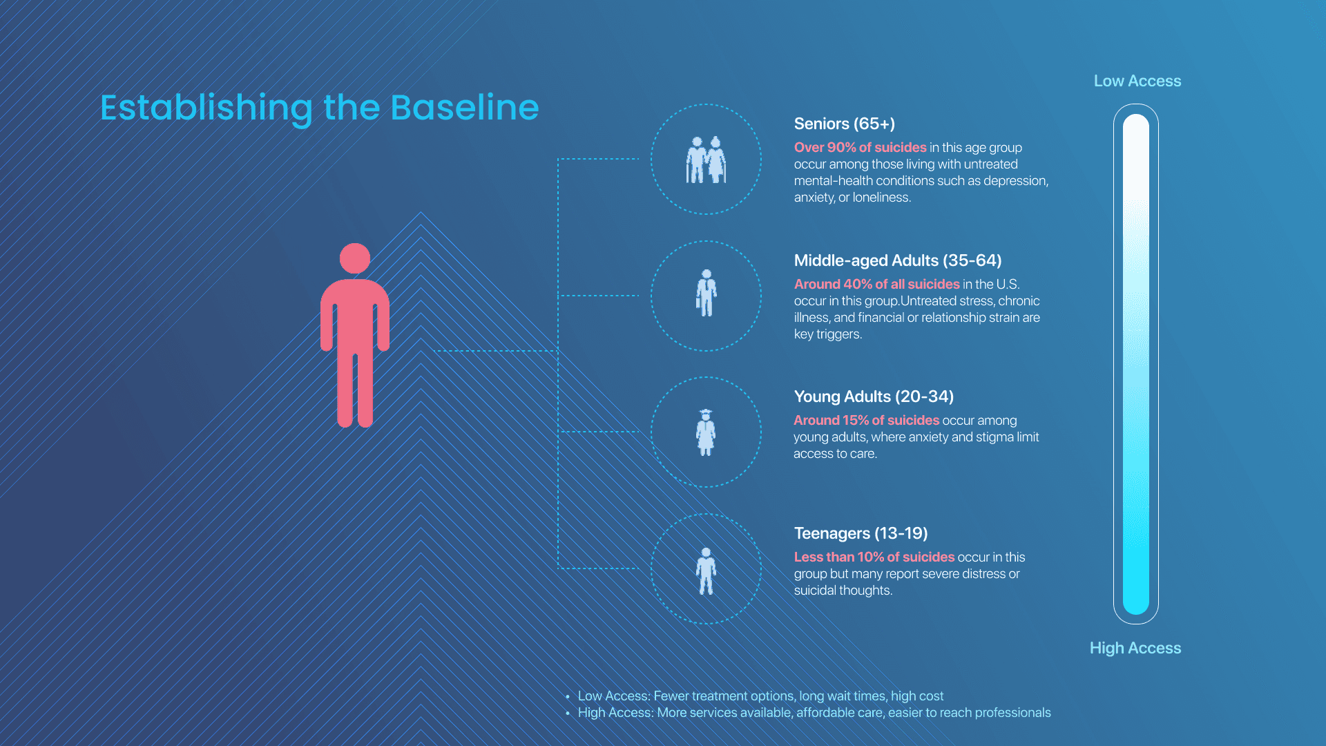 Although mental health data exists in reports and research, the gap between suicide risk and treatment access across age groups is not easily visible to the public. Complex statistics make it difficult for people to recognize where support is most lacking.