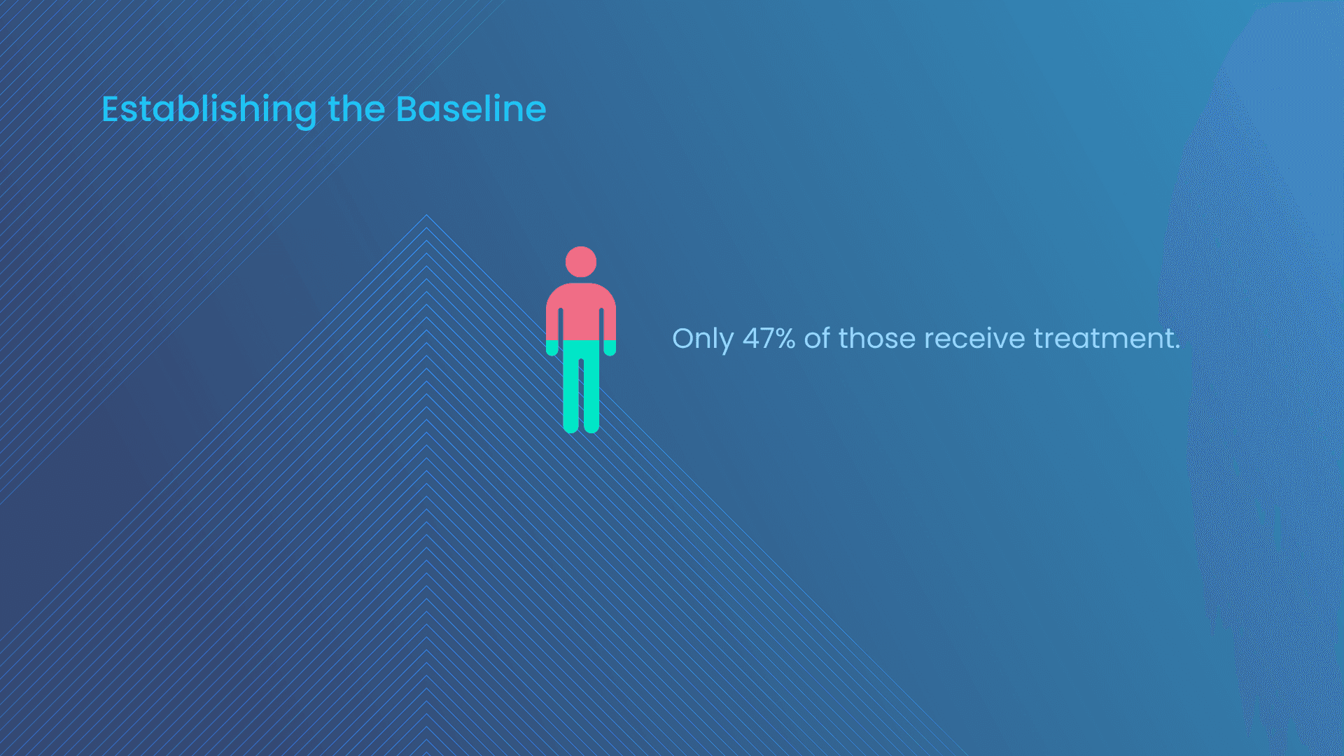 Each dot represents a person. Pink dots show people living with untreated conditions, while purple dots represent people receiving care. The gradient from the center outward shows the strength of access to treatment. So instead of reading through number, people can immediately see where support begins to drop off.