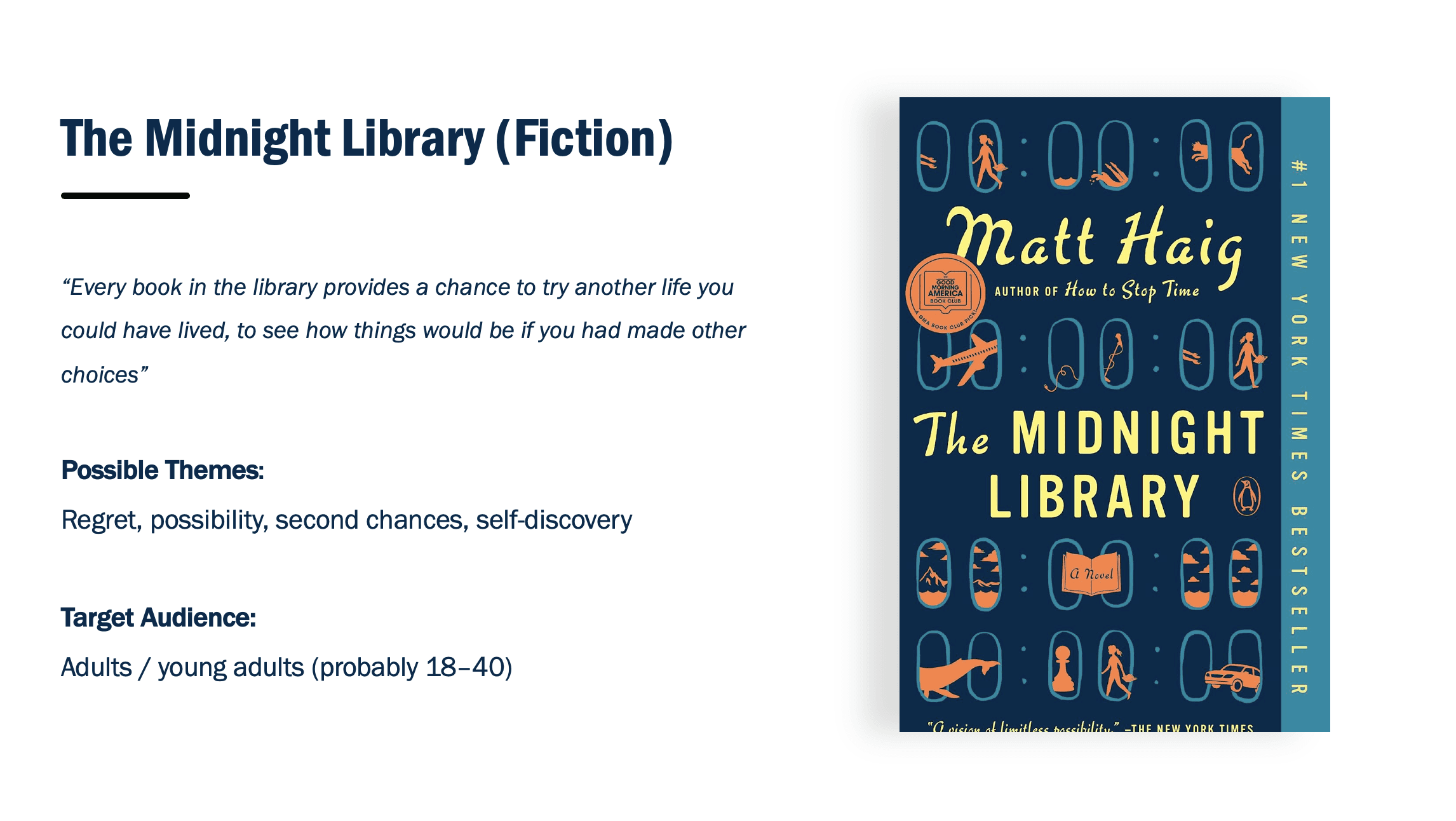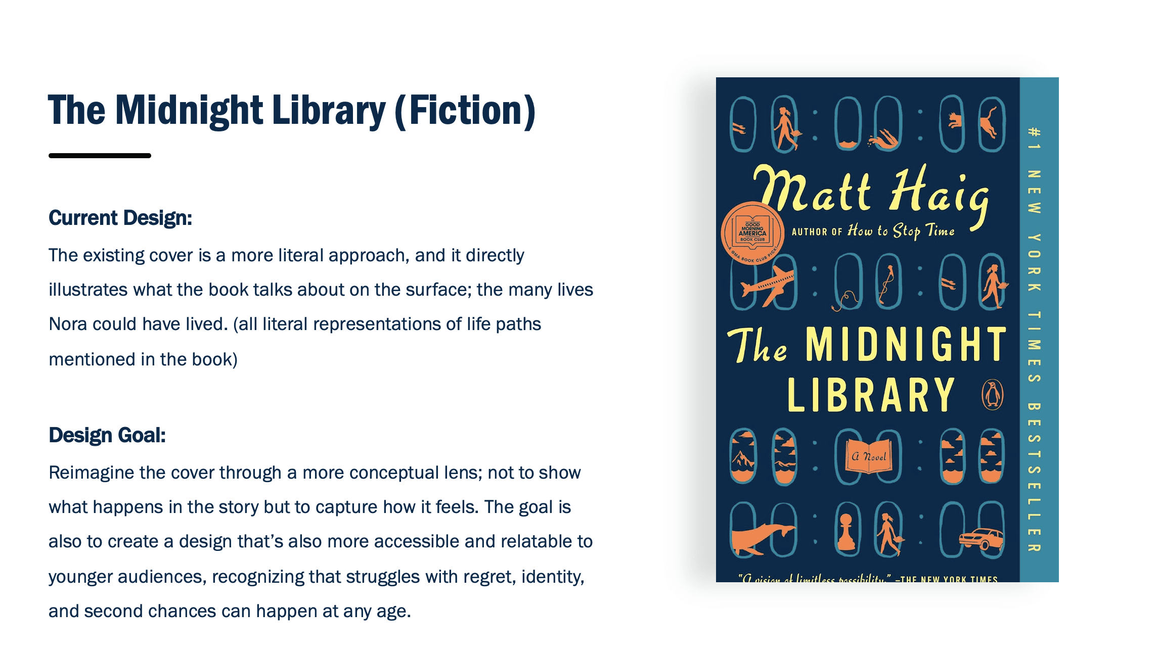 Before exploring visual directions, I studied The Midnight Library’s narrative themes and reviewed existing book covers to understand how the story has been visually interpreted. This helped identify common tropes to avoid and opportunities to approach the cover through a more conceptual and emotionally driven lens.