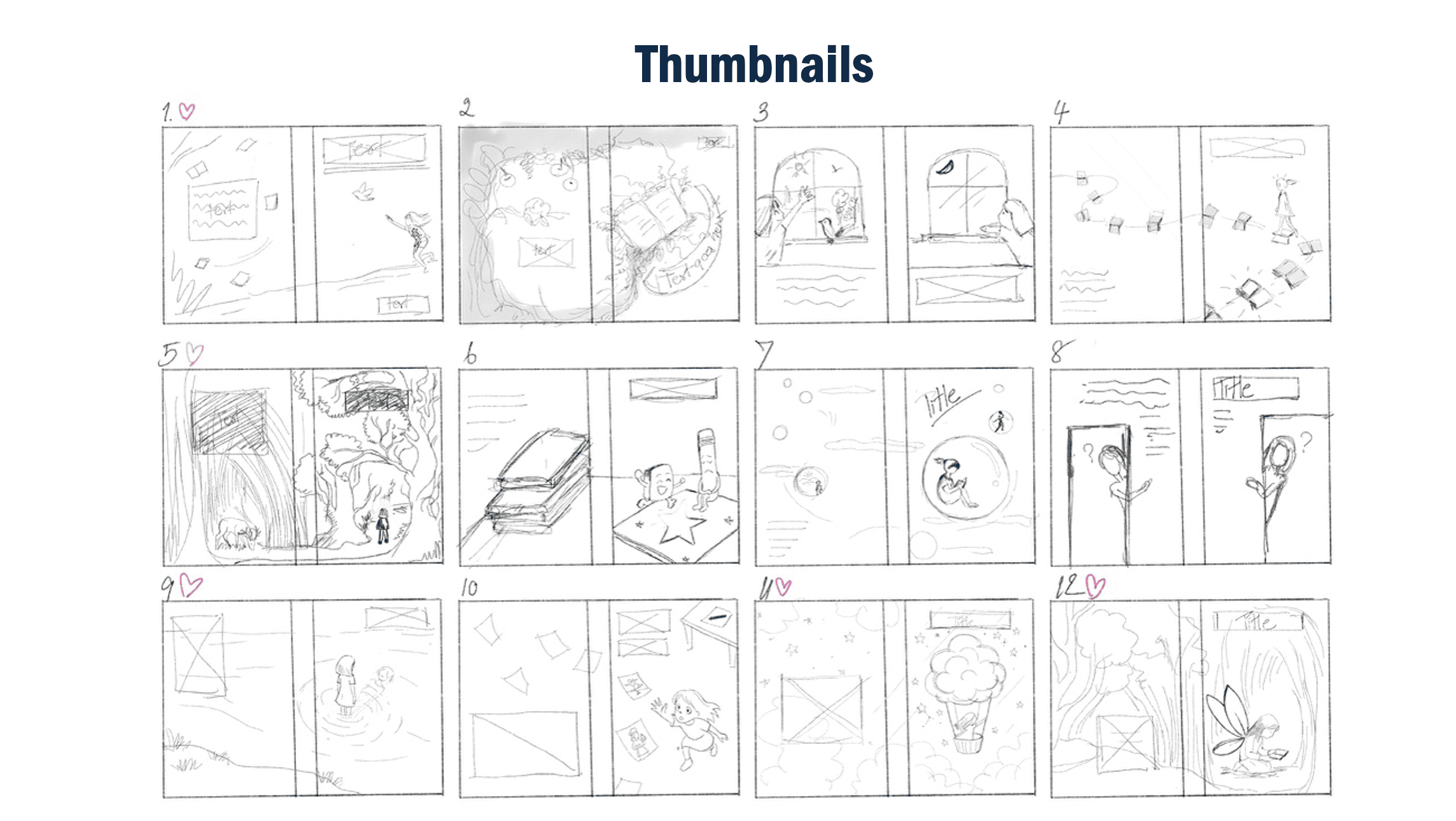 Thumbnail sketches explored the ideas how reflection, stillness, and contrast could communicate this shift in perspective. The final composition emphasizes quiet transformation rather than action, using a dreamlike palette and soft lighting to support the story’s quiet, reflective mood tone.