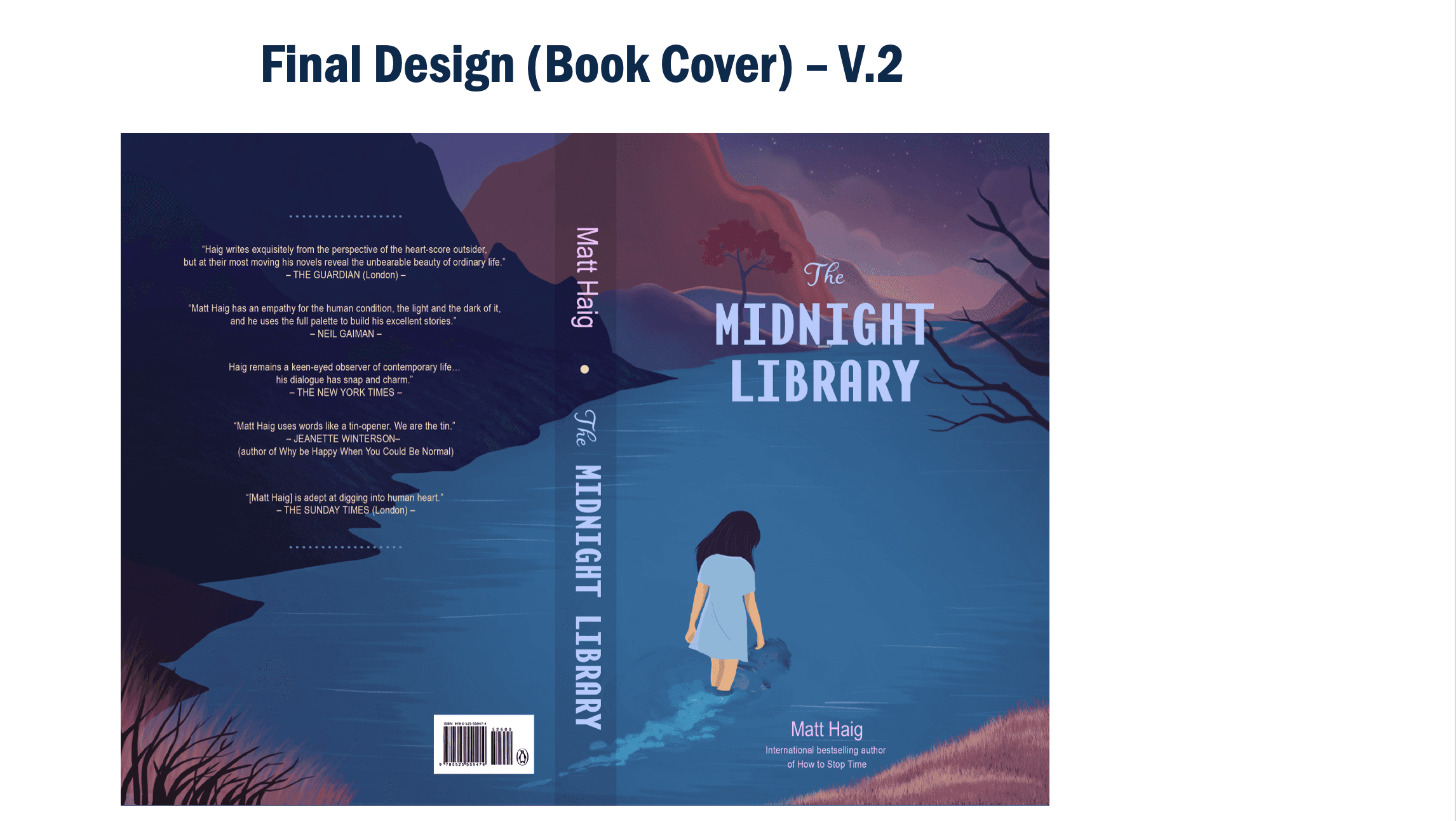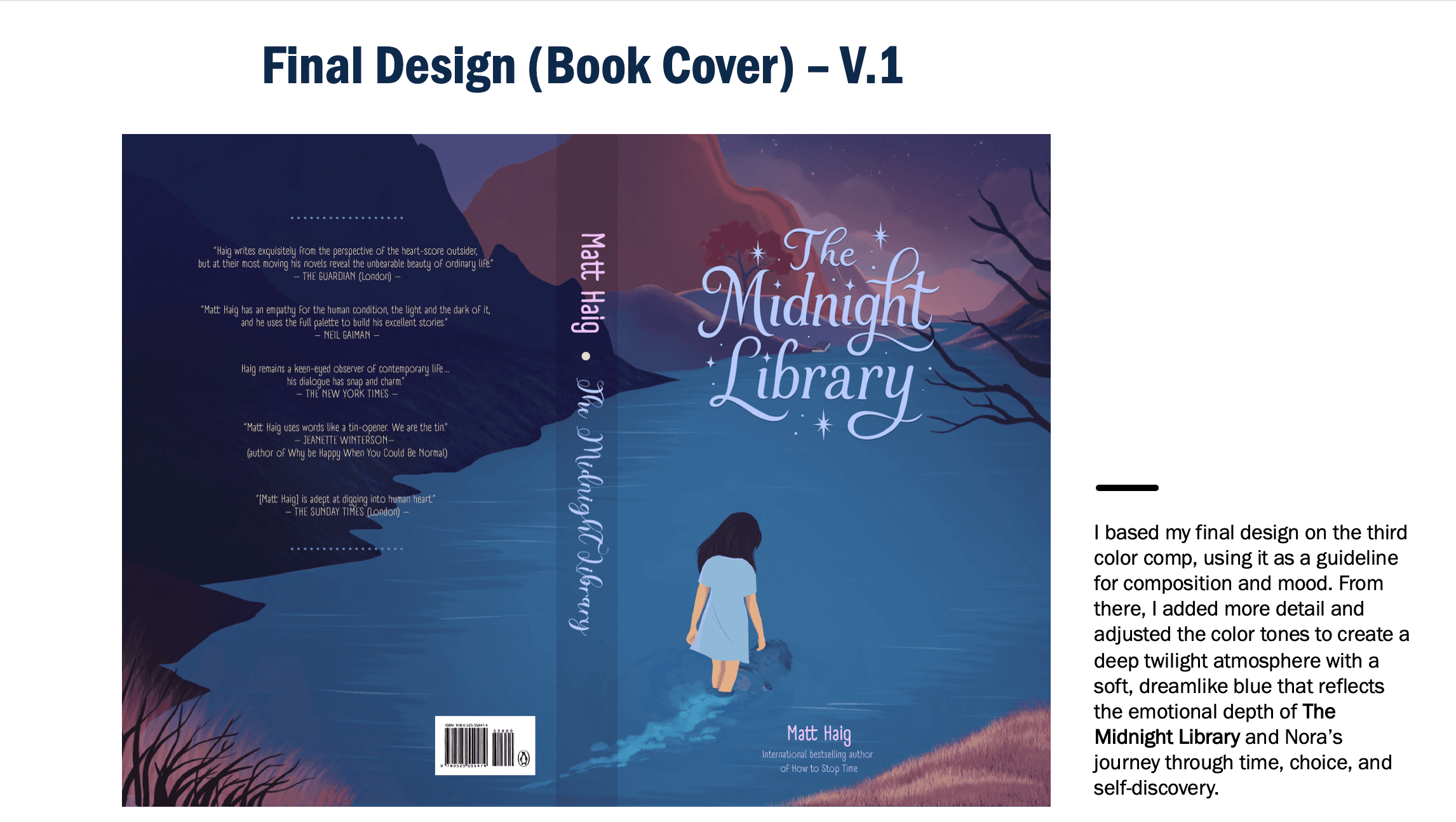 This project reimagines the book cover for The Midnight Library through a conceptual illustration approach. Rather than depicting literal scenes from the story, the goal was to capture the emotional experience of regret, shifting perspective, and the quiet hope found in second chances. The final design aims to resonate with younger adult audiences by translating the book’s themes into a poetic and relatable visual metaphor.