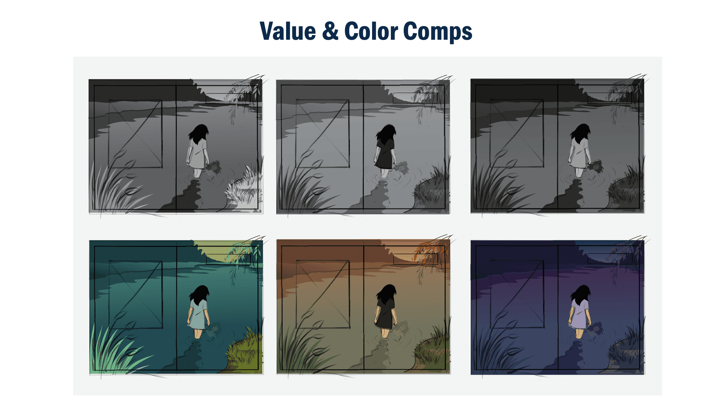 Developed value and color comps to test contrast, readability, and emotional impact. Different palettes and lighting conditions were compared to ensure the final direction supported the narrative tone and translated clearly at book-cover scale.