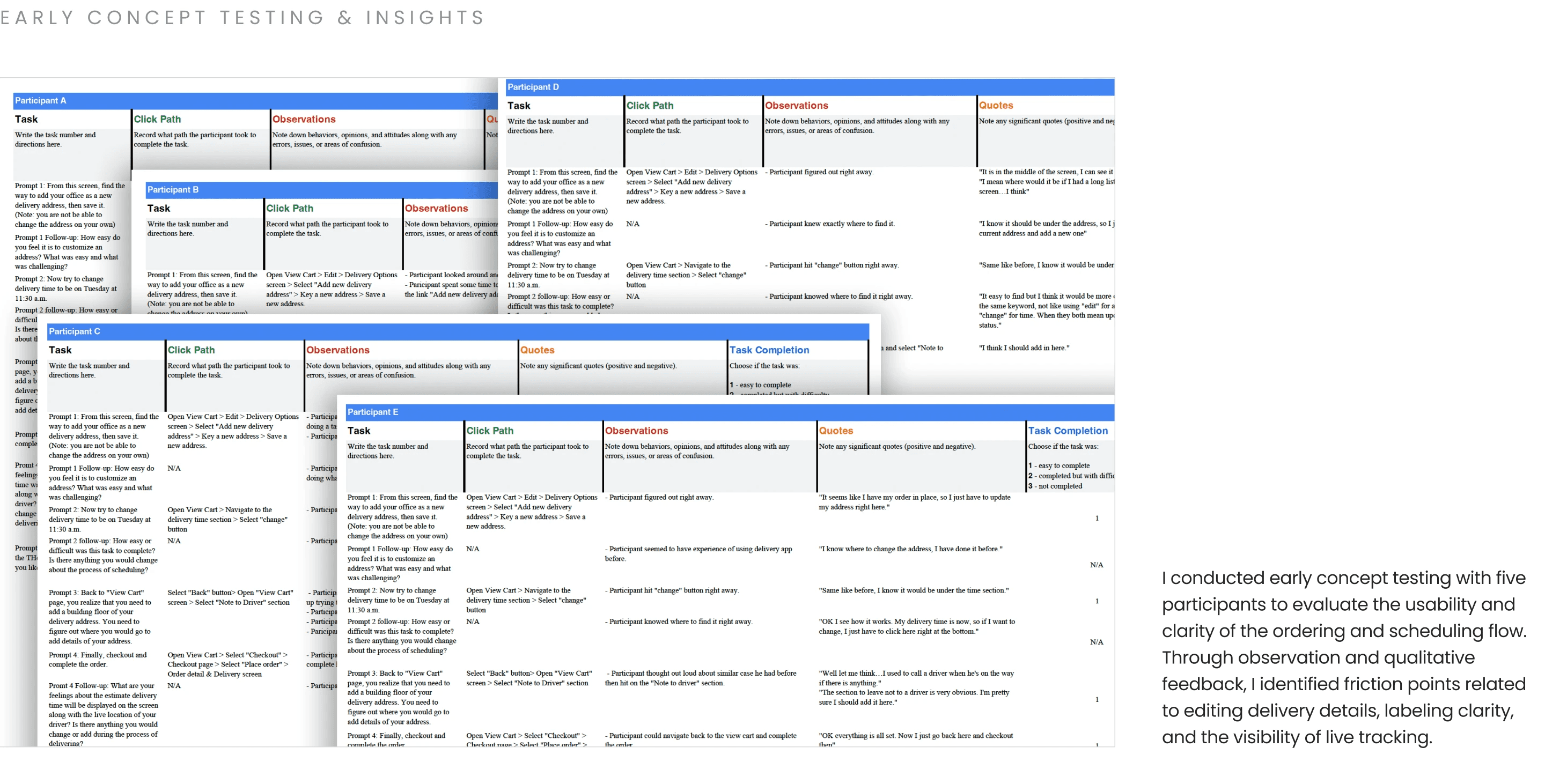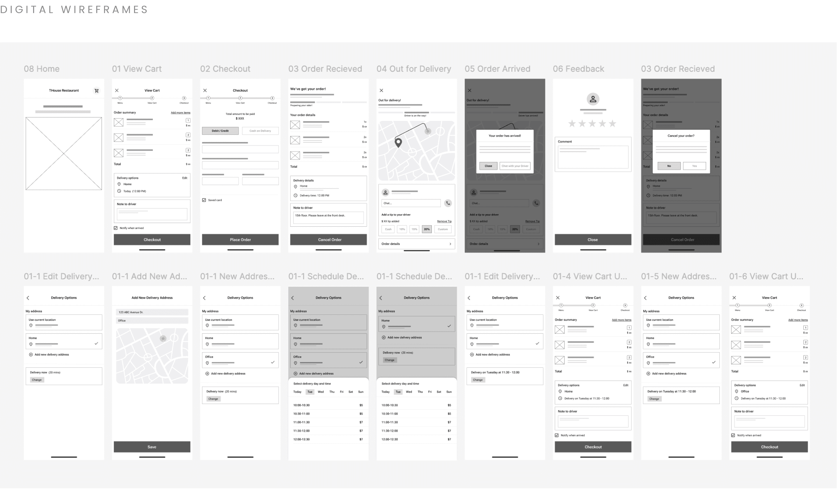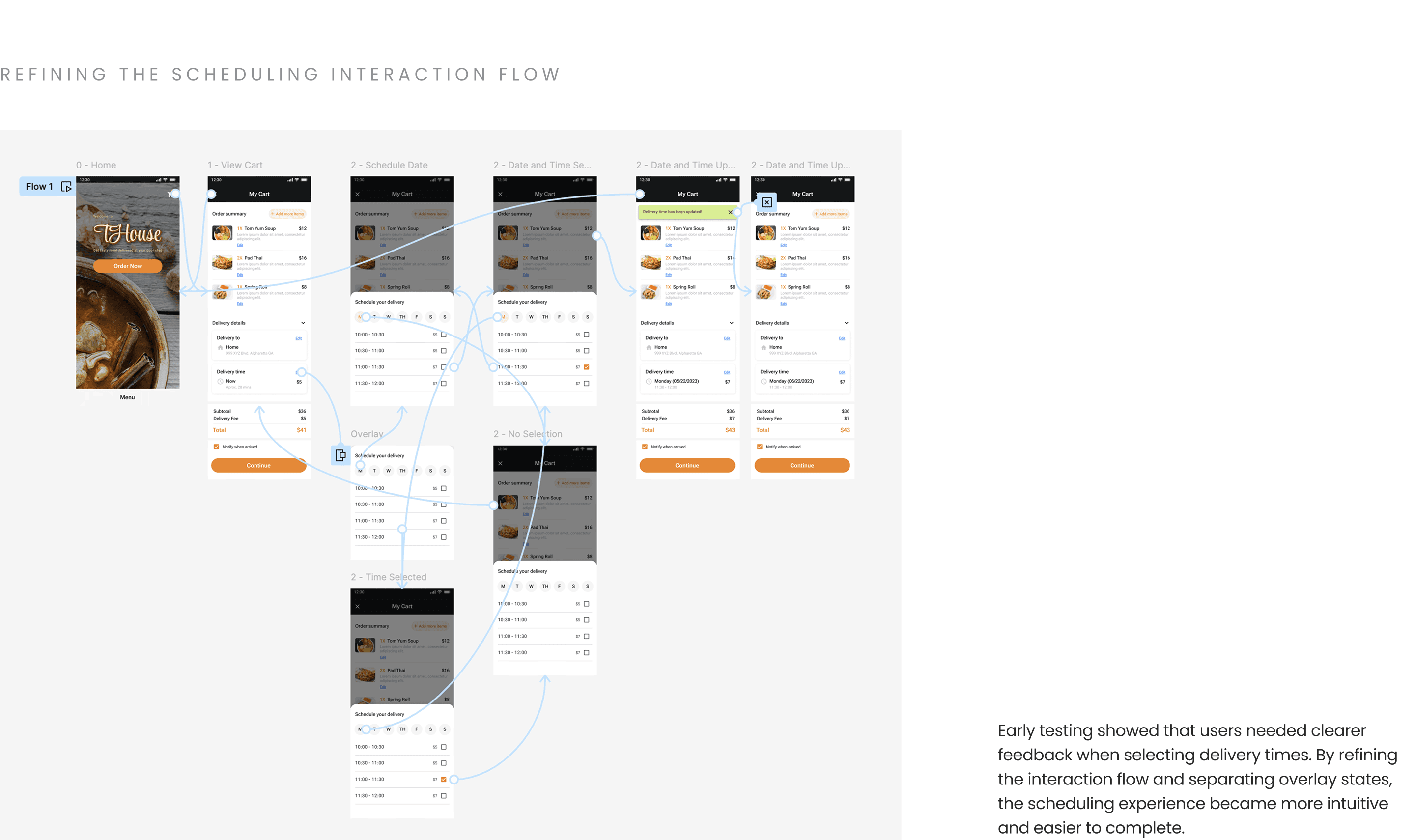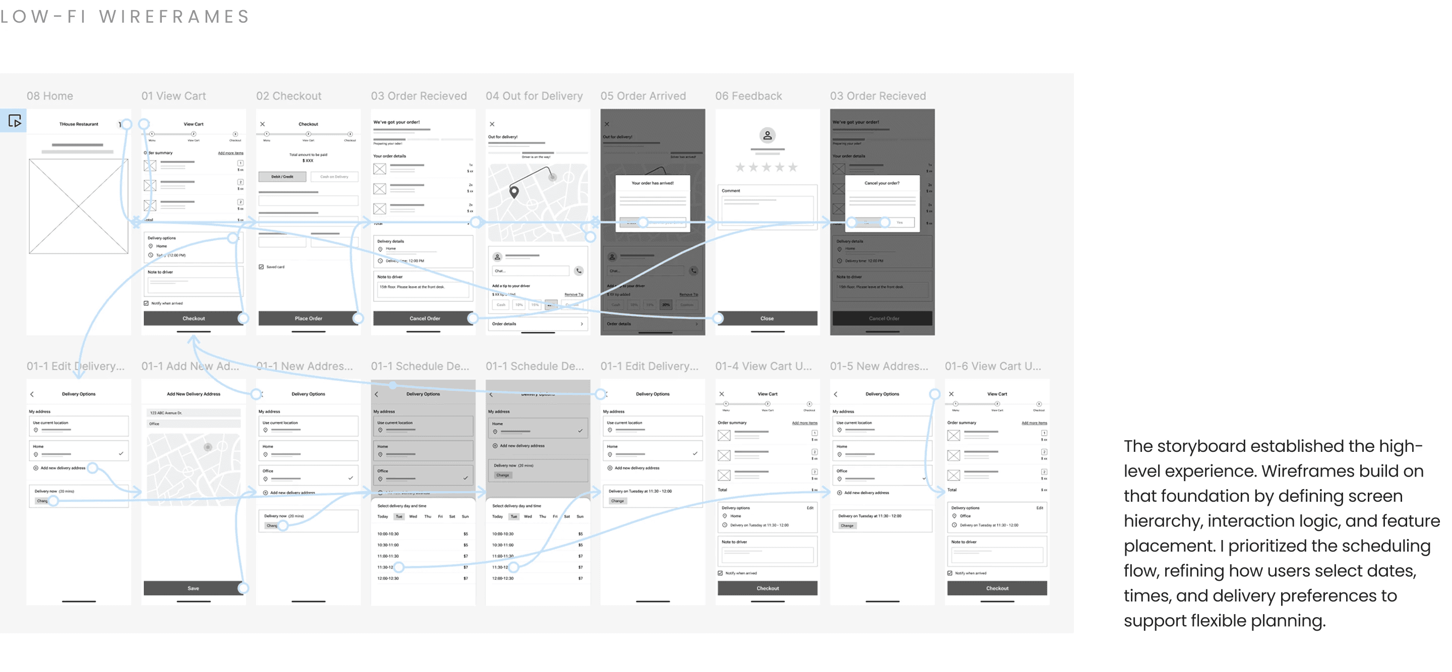 In this low-fidelity prototyping phase, I translated wireframes into a clickable prototype to test the end-to-end delivery and scheduling flow. This allowed me to validate navigation logic, interaction patterns, and decision points before investing in visual design.