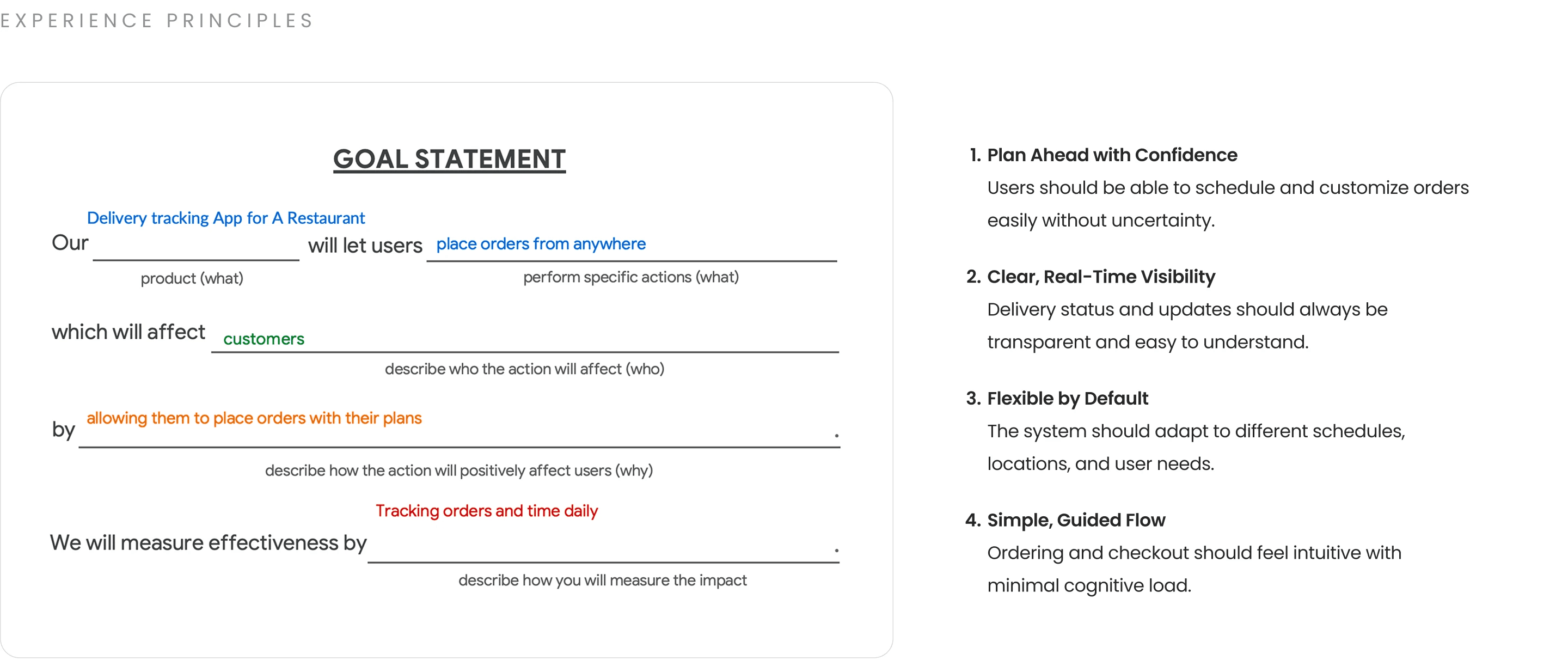 From this goal, I defined a set of experience principles to guide design decisions and ensure alignment with user needs.