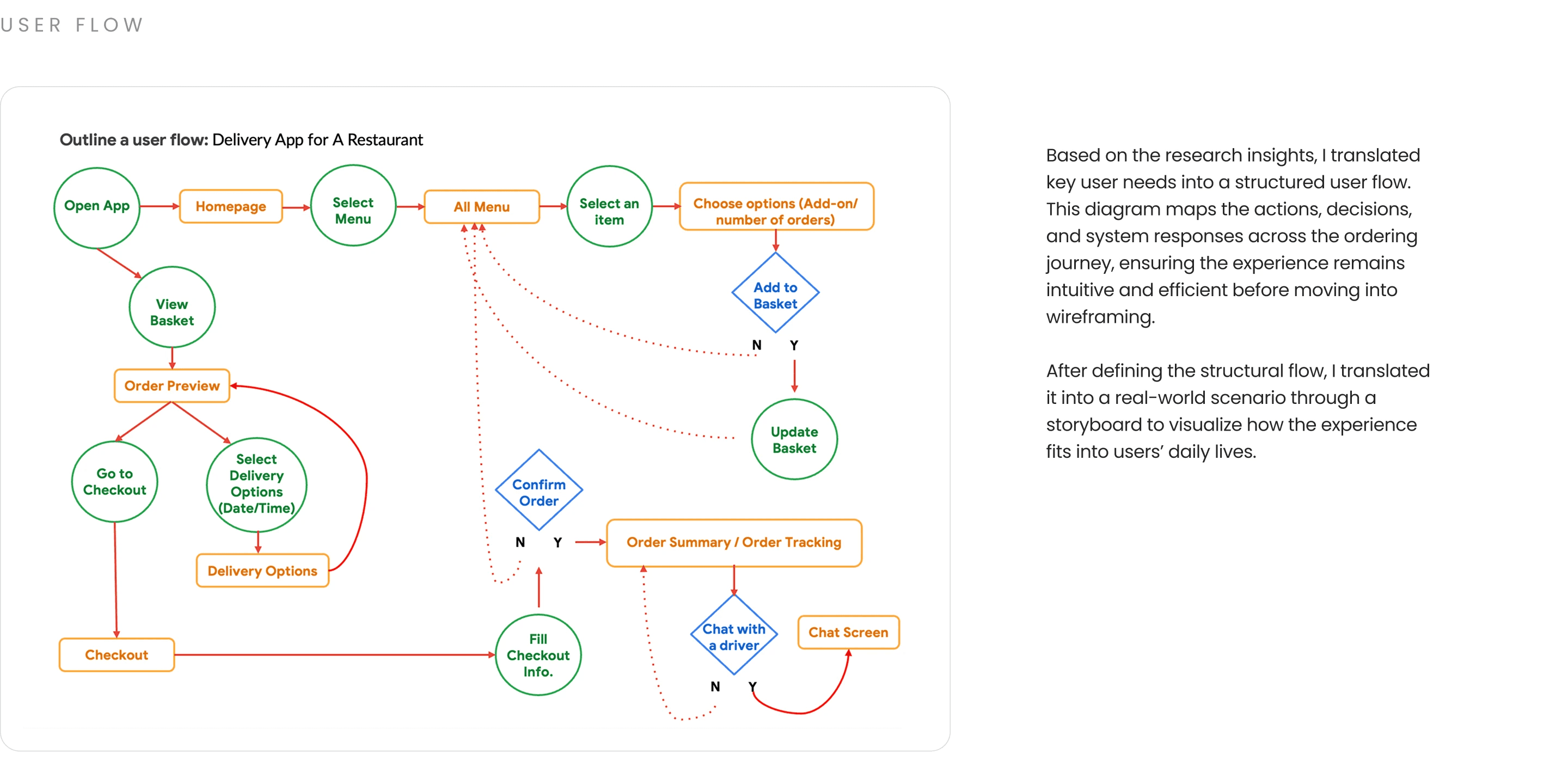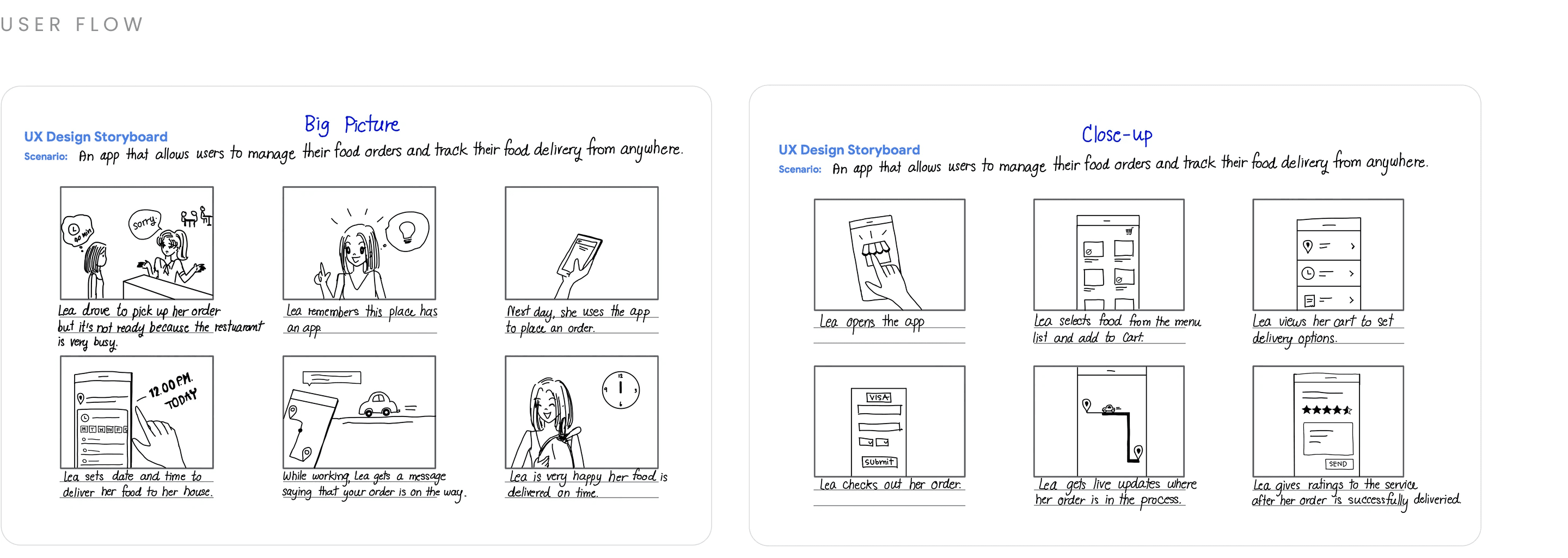 Storyboards, low fidelity sketches, and early prototypes were created to simulate key scenarios, from selecting a location and scheduling a delivery to confirming order details. This process tested how user inputs, timing logic, and system responses work together to