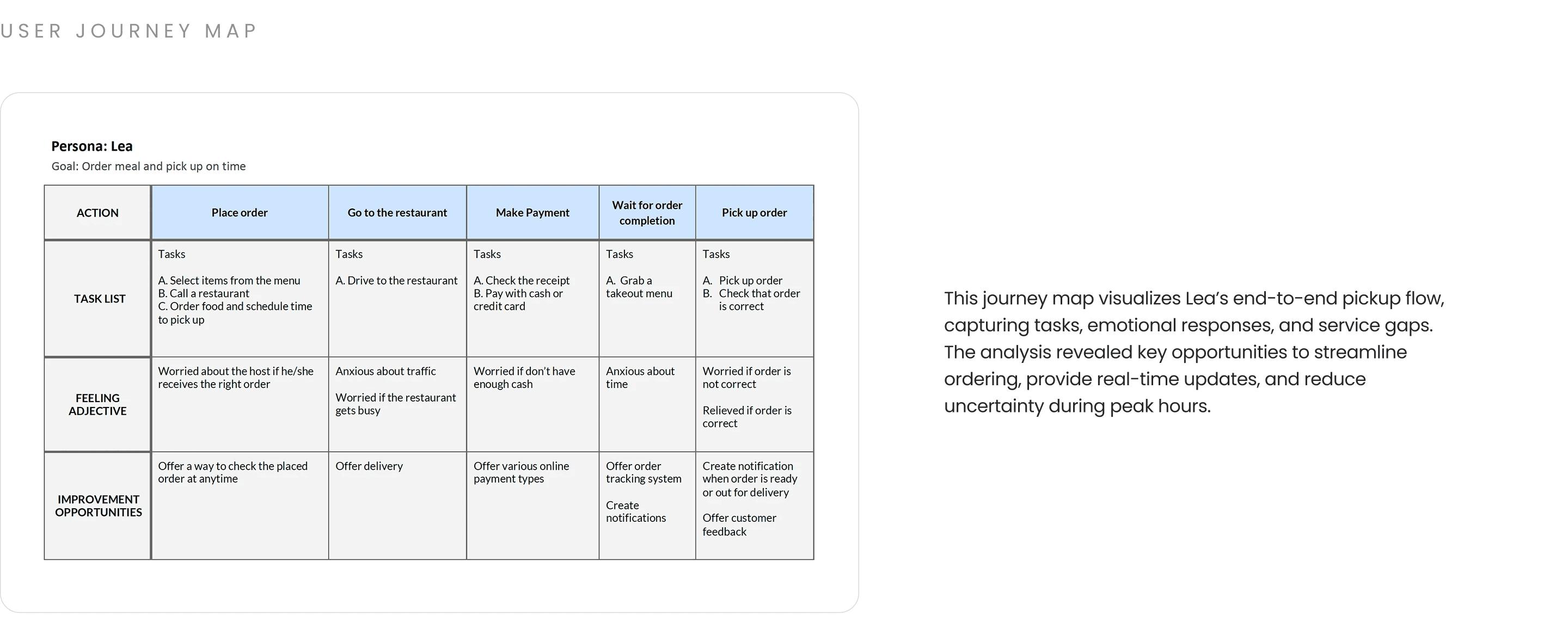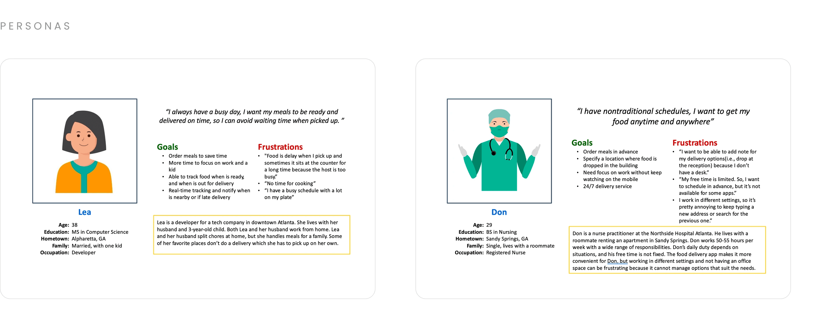 Creating personas helped synthesize research findings into representative user types, allowing common pain points to surface clearly. Insights revealed that busy customers often lack time for in-person pickup and are frustrated by limited delivery customization options in existing local platforms.