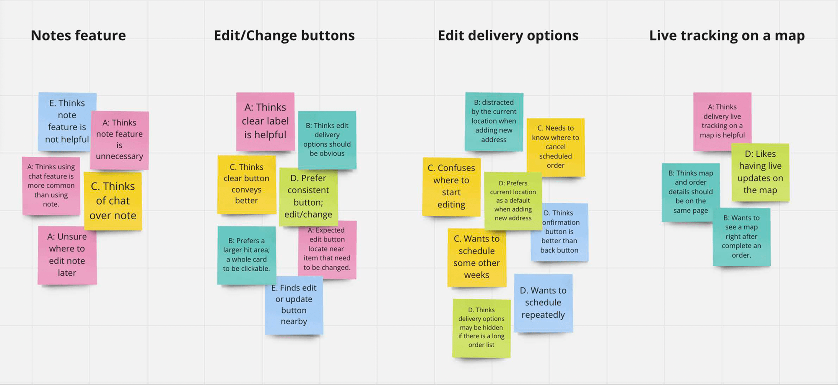 To synthesize the findings, I created an affinity diagram to group recurring themes, uncover patterns in user behavior, and prioritize key areas for refinement. This process allowed me to translate raw feedback into actionable design improvements before moving into higher-fidelity iterations.
