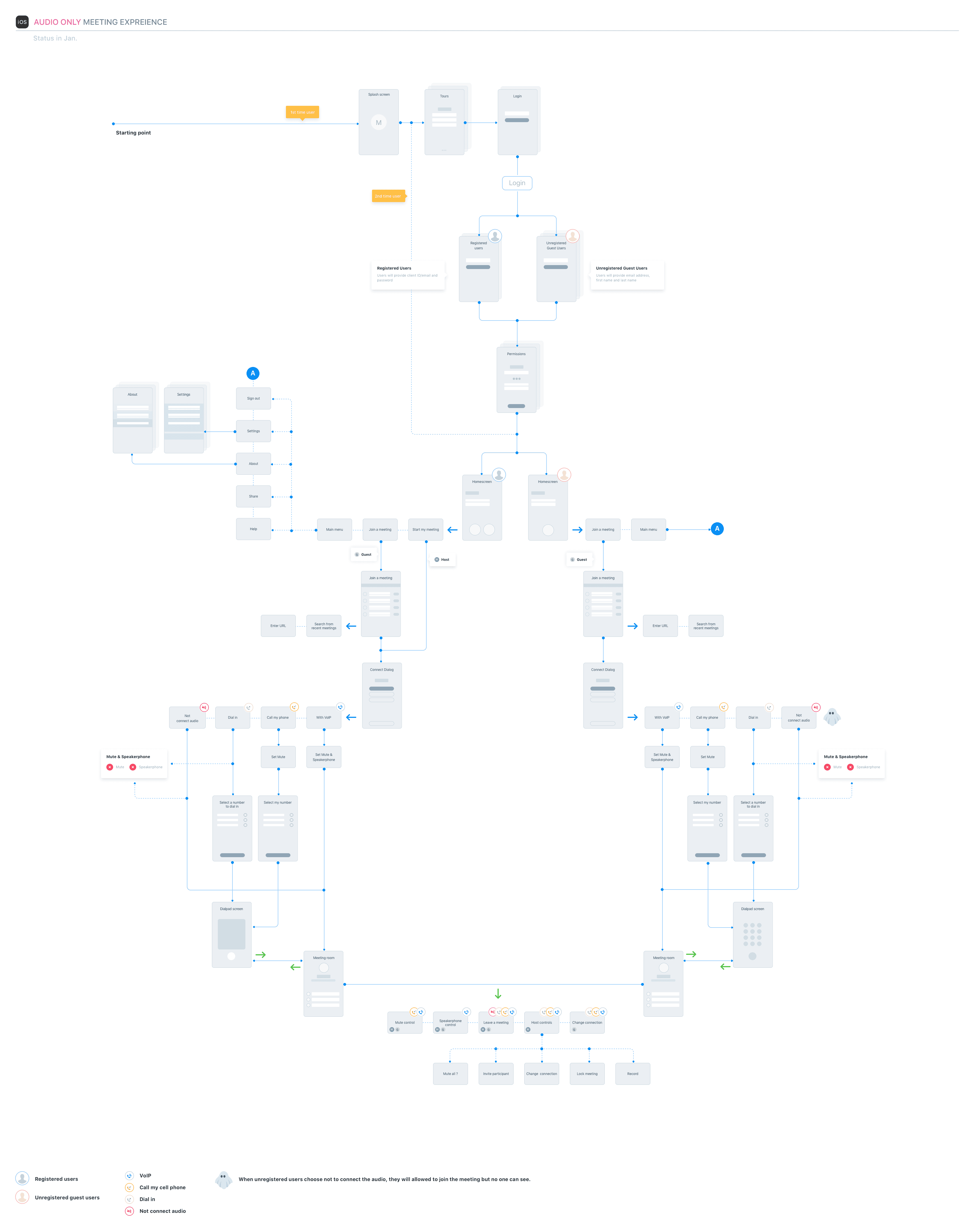 I mapped end-to-end user flows for mobile screen sharing, including edge cases such as permission handling, presenter status, and transitions between video, audio, and shared content.
